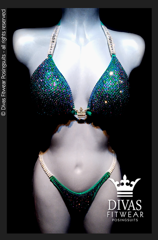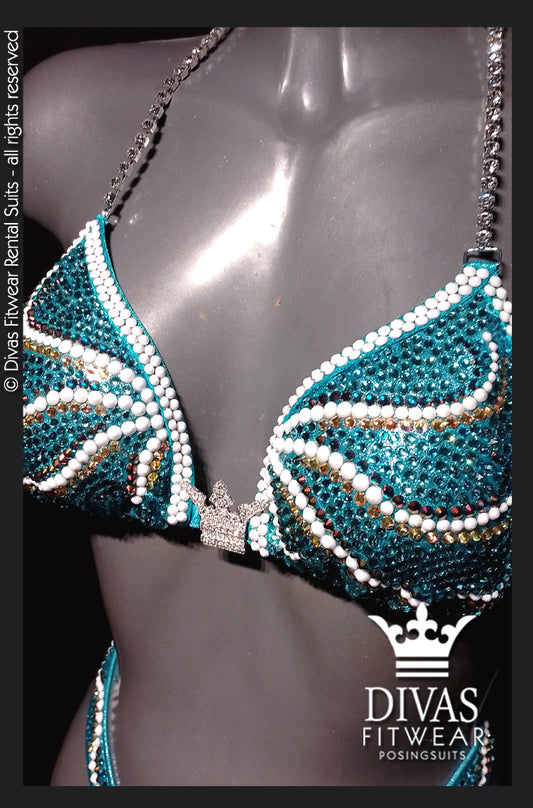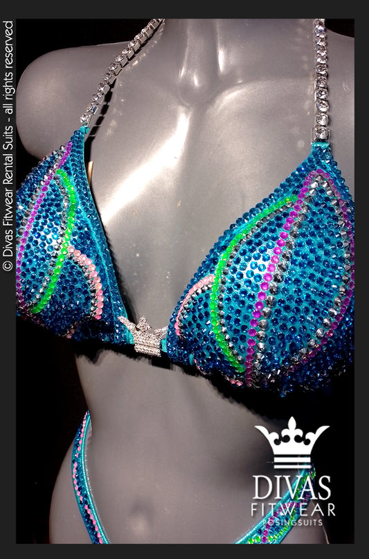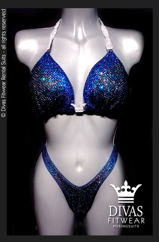 Loved the Frozen bikini from Diva's! Stunning suit with sparkles and pearl style decoration. Love the clips on the bikini bottoms, there is no way of the clips coming apart giving confidence on stage. Lovely fit and Babet did send some fillers if i needed them. I would definitely hire this suit again. Loved it.